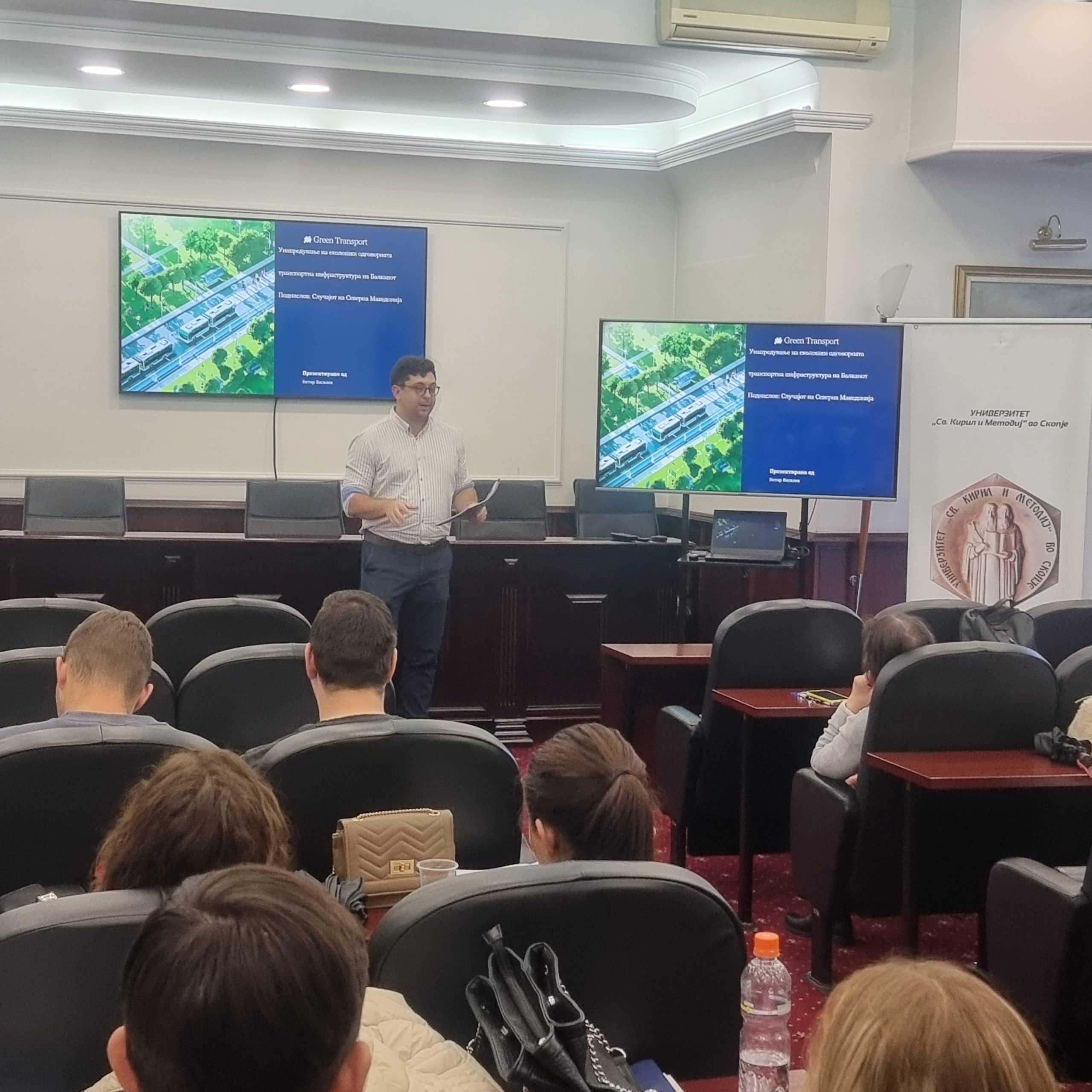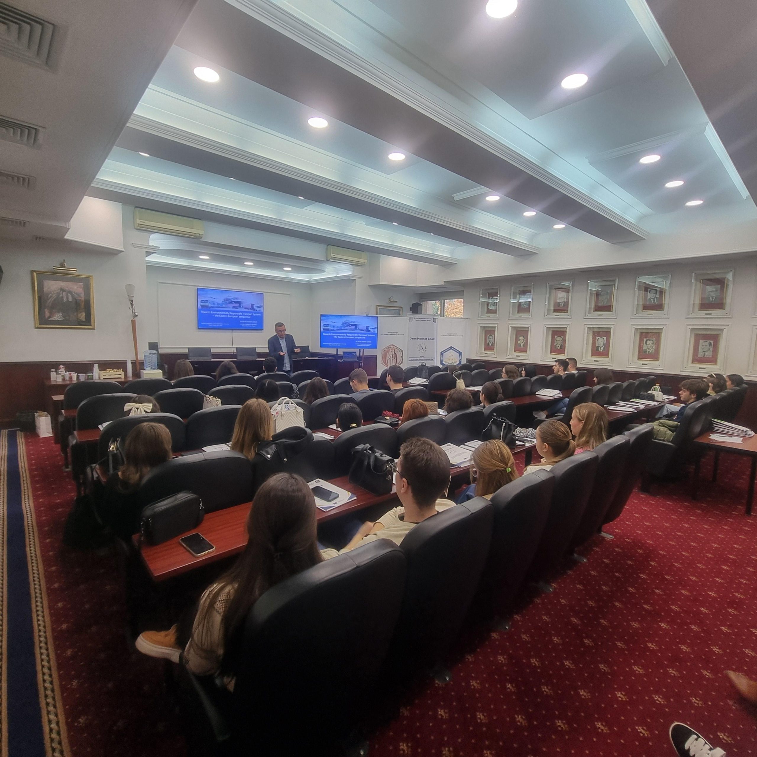 On October 28, 2025, the Faculty of Economics – Skopje, Ss. Cyril and Methodius University in Skopje, successfully organised a one-day EU training. The event brought together 31 participants, including university professors, professionals, and students from the Faculty of Economics–Skopje, the Faculty of Law “Iustinianus Primus”, and the Secondary School of the City of Skopje — “Orce Nikolov” Gymnasium. The aim was to promote dialogue and share knowledge on the green transformation of the transport sector and the challenges of achieving sustainable mobility in Eastern and Southeastern Europe.